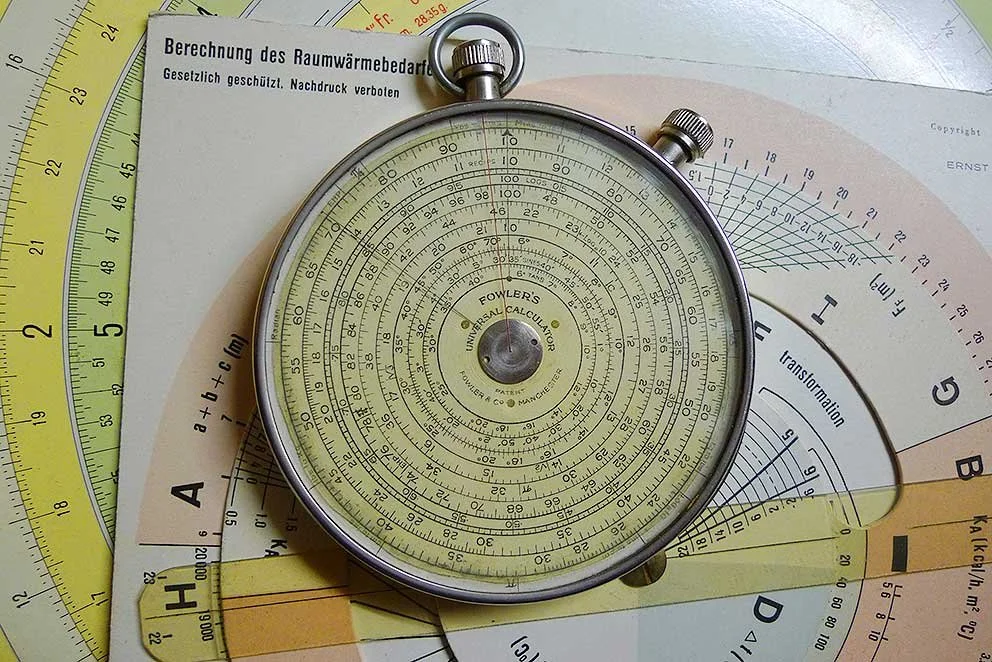 Fowler’s Universal Calculator ist eine Rechenuhr mit zwei Drehknöpfen. Das Ziffernblatt ist mit einem rotierenden roten radialen Haarzeiger für sechs separate kreisförmige Skalen synchronisiert. Die Skalen sind: Multiplikation und Division, eine reziproke Skala (gegen den Uhrzeigersinn drehbar), Logarithmus, Kubik und Kubikwurzeln, Quadrate, Sinus und Tangens von Winkeln.