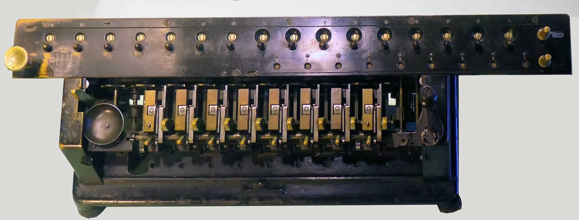 Offene Vier-Spezies-Staffelwalzenmaschine mit Schieber und Kurbel. Es ist eine 8 x 9 x 16-Maschine. TIM steht für Time Is Money.