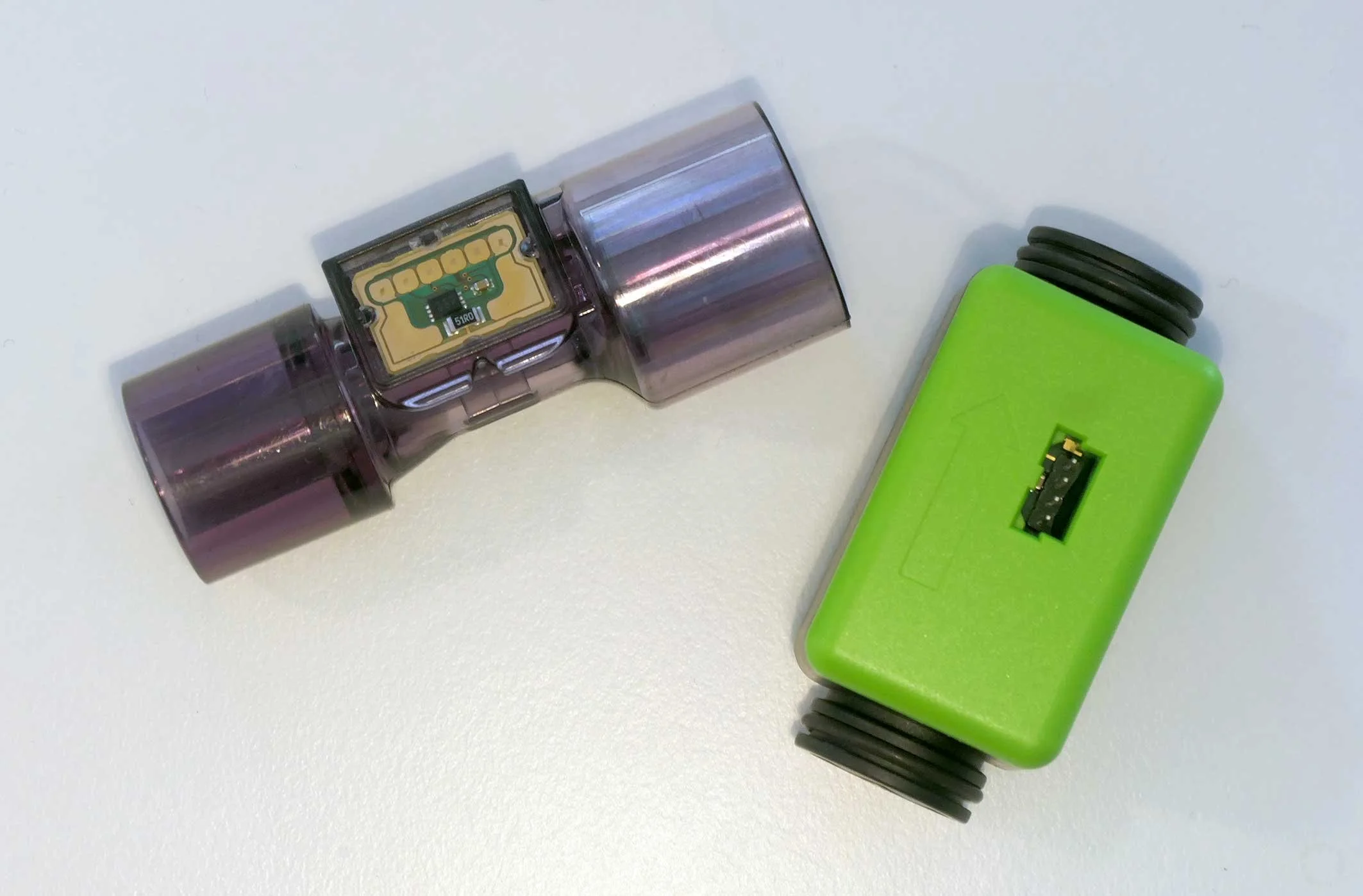 Der SFM3300-AW (links) ist ein proximaler Sensor, der v.a. in Beatmungsgeräten eingesetzt wird. Er weist eine hohe Messgenauigkeit und eine kurze Signalverarbeitungszeit auf. Er ist kalibriert für die Gase Air, N2 und O2.